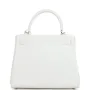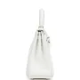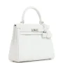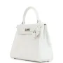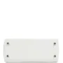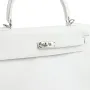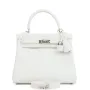 This Kelly, in the Retourne style, is in New White swift leather with palladium hardware and has tonal stitching, front flap, two straps with center toggle closure, clochette with lock and two keys, single rolled handle and an optional shoulder strap.