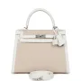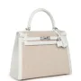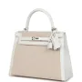This Kelly, in the Sellier style, is in New White swift leather and Ecru-Beige Toile H canvas with palladium hardware and has tonal stitching, two straps with front toggle closure, clochette with lock and two keys, single rolled handle and removable shoulder strap.